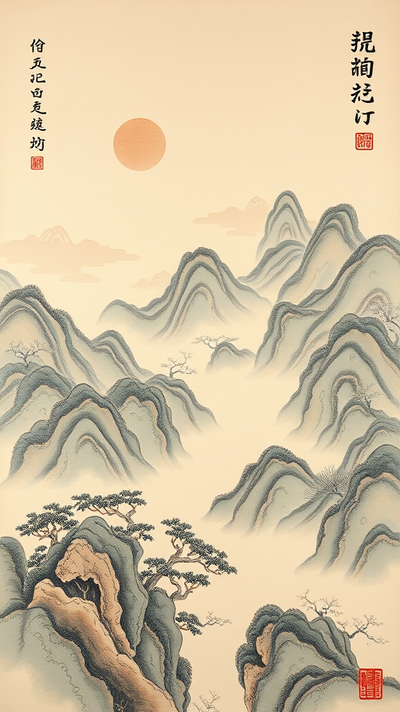 Traditional oriental painting with soft, muted colors and intricate backgrounds featuring serene landscapes, combining chaos and harmony with an elongated vertical aspect ratio, raw artistic style, and a hint of imaginative flair to enhance the traditional aesthetic.