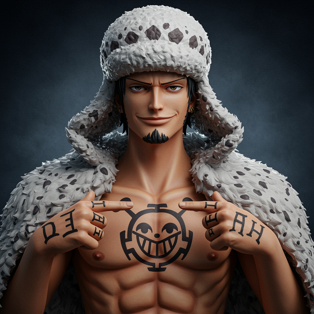 Trafalgar D. Water Law from One Piece anime portrayed as an ultra-realistic, hyper-detailed, slim young man of tall stature with a confident smirk. He wears a distinctive northern-style fur hat, white with a spotted pattern along the bottom and the brim. His short, dark hair is complemented by dark sideburns and a neatly trimmed goatee. Both hands are adorned with letters tattooed in black on the back of each finger, spelling D E A T H. His chest bears a striking tribal-style heart tattoo featuring his Jolly Roger. The portrait boasts ultra-realistic, hyper-detailed features with cinematic lighting and high contrast, akin to character concept art seen on ArtStation. The composition is rendered in 8K, maintaining the essence of the original inspiration with subtle creative differences.