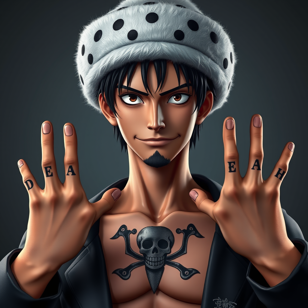 Trafalgar D. Water Law from One Piece as an ultra-realistic, hyper-detailed character. He appears as a slim, young man of relatively tall height with a confident smirk on his face. He wears a distinct northern-style fur hat, white with a spotted pattern circling the bottom and bill. His short, dark hair is complemented by dark sideburns and a small goatee, adding to his enigmatic allure. On the back of each hand are bold, black letters spelling D E A T H tattooed across his fingers. His chest bears a tribal-style heart tattoo featuring his iconic Jolly Roger symbol. The portrait captures him in ultra-realistic detail with cinematic lighting and high contrast, delivering a vivid impression. This character concept art is rendered in 8K resolution, evoking an ArtStation style with subtle creative modifications to the classic design.