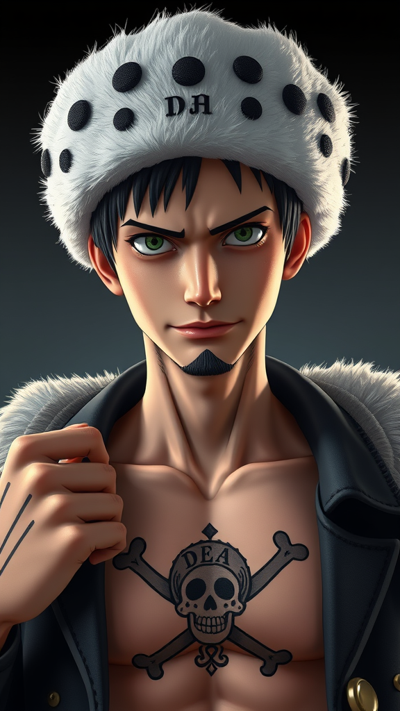 Trafalgar D. Water Law from One Piece is depicted as an ultra-realistic, hyper-detailed character. He is a slim young man of relatively tall height with a confident smirk on his face. He dons a distinctive northern-style fur hat, white with a unique spotted pattern encircling the bottom edge and bill. His short dark hair is complemented by dark sideburns and a neatly groomed small goatee. The back of each finger is inked with the letters D E A T H in bold black tattoos, hinting at his notorious reputation. His chest is adorned with a tribal-style heart tattoo featuring his Jolly Roger emblem, symbolizing his pirate affiliation. The portrait showcases him in cinematic lighting, with high contrast that captures every intricate detail of his expression and attire, creating a stunning 8K character concept art perfect for showcasing on ArtStation. Small creative modifications enhance the overall impact while staying true to the core essence of his character.