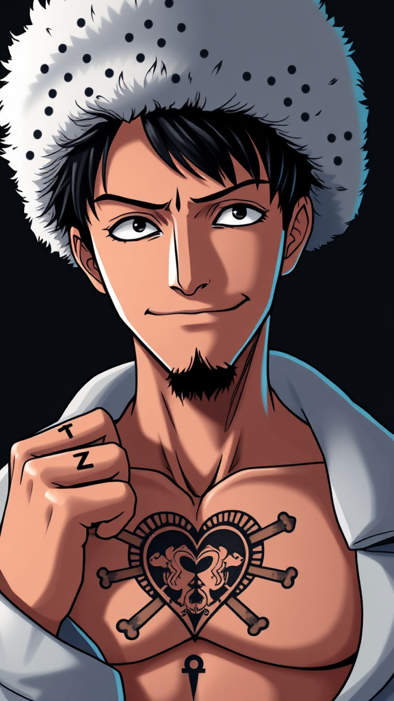 Trafalgar D. Water Law from the One Piece anime, depicted as a slim young man of relatively tall height with a confident smirk. He wears a distinctive northern-style fur hat, predominantly white with a subtle spotted pattern along the base and brim. His hair is short and dark, accompanied by dark sideburns and a neatly trimmed goatee. The letters D E A T H are boldly tattooed in black across the back of each finger. His chest features a tribal-style heart tattoo intricately designed with his Jolly Roger emblem. This ultra-realistic, hyper-detailed portrait captures him in cinematic lighting with high contrast. The artwork aims for high fidelity as it would appear on ArtStation, embodying character concept art in 8K resolution with some creative enhancements while maintaining the essence of the character.