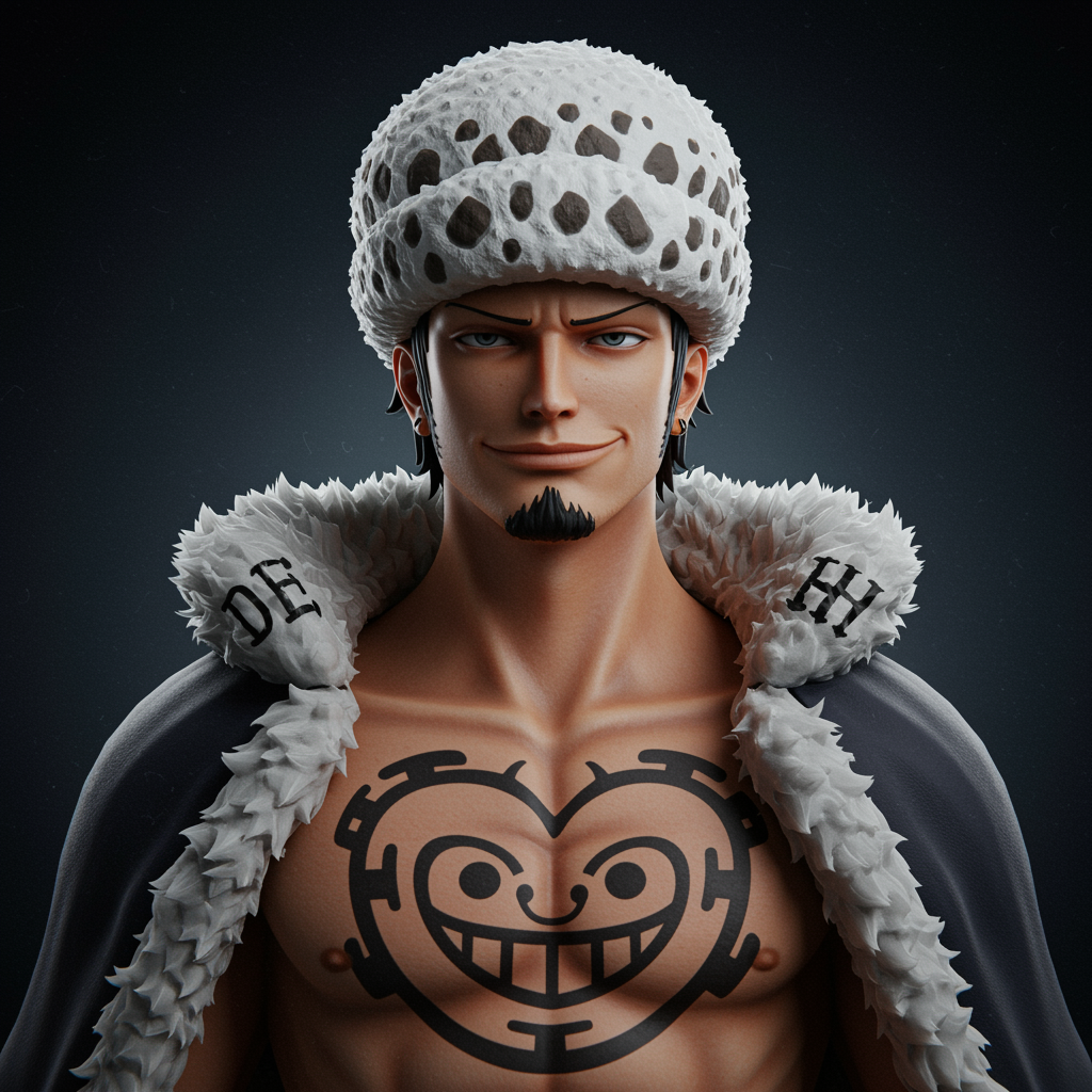 Trafalgar D. Water Law from the One Piece anime, depicted as an ultra-realistic, hyper-detailed character. He is a slim young man of relatively tall height, his expression marked by a confident smirk. On his head, he wears a northern-style fur hat that is white with a distinctive spotted pattern along the brim and bill. His hair is short and dark, complemented by prominent sideburns and a small goatee. Displayed across the back of his fingers are black tattoos of the letters spelling D E A T H. His chest features a tribal-style heart tattoo incorporating his unique Jolly Roger symbol. The portrait is rendered in ultra-realistic, hyper-detailed style with cinematic lighting that emphasizes high contrast. The overall presentation is inspired by high-quality character concept art typically found on ArtStation, rendered in 8K resolution, slightly altering his facial features to add an air of mystery and intelligence, enhancing his intense, captivating presence.