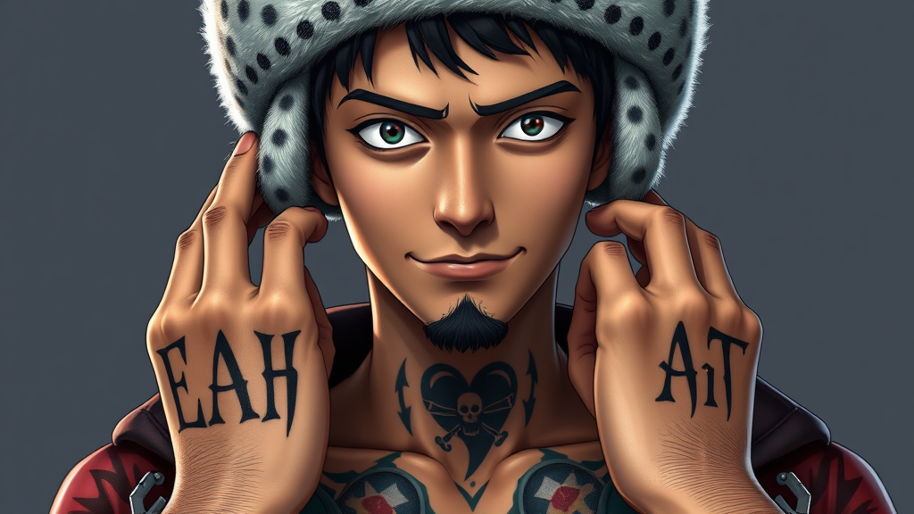 Trafalgar D. Water Law, inspired by One Piece anime, depicted as an ultra-realistic, hyper-detailed character. He is a slim young man of relatively tall height with a confident smirk on his face. He wears a distinctive northern-style fur hat, predominantly white with a spotted pattern along the bottom and the brim. His short, dark hair contrasts with his defined dark sideburns and neatly trimmed small goatee. The back of his hands bears bold letters tattooed in black, spelling out D E A T H. On his chest, a striking tribal-style heart tattoo is emblazoned with his personal Jolly Roger. The portrait captures cinematic lighting with high contrast, showcasing ultra-realistic, hyper-detailed features. This character concept art is designed for high-resolution, 8K display, blending the essence of adventure with artistic flair, akin to gallery-quality work on platforms like ArtStation. Small creative elements subtly enhance the core concept, offering a fresh perspective on this iconic character.