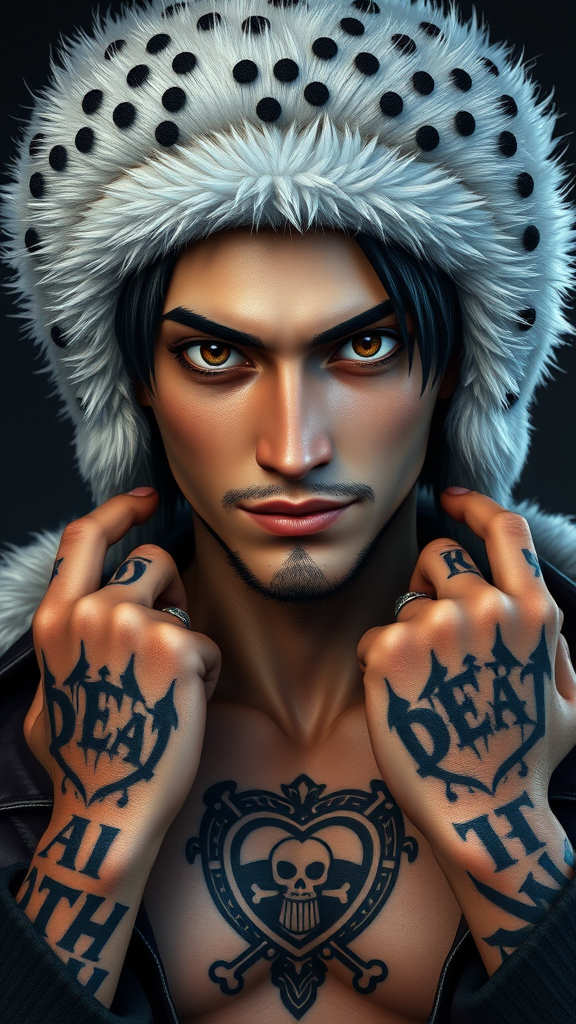 Trafalgar D. Water Law, inspired by One Piece anime, embodied as an ultra-realistic, hyper-detailed slim young man of tall stature. He wears a northern-style fur hat that is white with a spotted pattern along the brim, conveying a sense of adventure. His expression carries a confident smirk, adding to his mysterious aura. His short dark hair, accompanied by dark sideburns and a small goatee, frames his face with a subtle air of rebellion. His hands are marked with bold black tattoos, spelling D E A T H across his knuckles, hinting at his formidable resolve. A tribal-style heart tattoo featuring his Jolly Roger is emblazoned on his chest. This portrait is captured with cinematic lighting and high contrast, showcasing every detail in an 8K resolution, making it ideal for character concept art on ArtStation. Creative touches enhance the visual narrative, adding depth to his enigmatic persona.