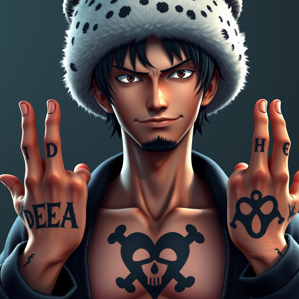 Trafalgar D. Water Law, inspired by One Piece anime, depicted as an ultra-realistic, hyper-detailed slim young man of relatively tall height. He sports a confident smirk on his face, donning a northern-style fur hat that is predominantly white with a distinct spotted pattern along its base and brim. His short dark hair, accented by dark sideburns and a small goatee, adds to his striking appearance. Both hands feature black tattoos spelling out D E A T H across the backs of his fingers. On his chest, a unique tribal-style heart tattoo is etched, incorporating his Jolly Roger emblem. The portrait captures him in cinematic lighting, with high contrast, reminiscent of artstation character concept art, rendered in 8K. His intense gaze is slightly softened by subtle adjustments to his expression, adding a layer of mystery to his character while maintaining the essence of the core concept.