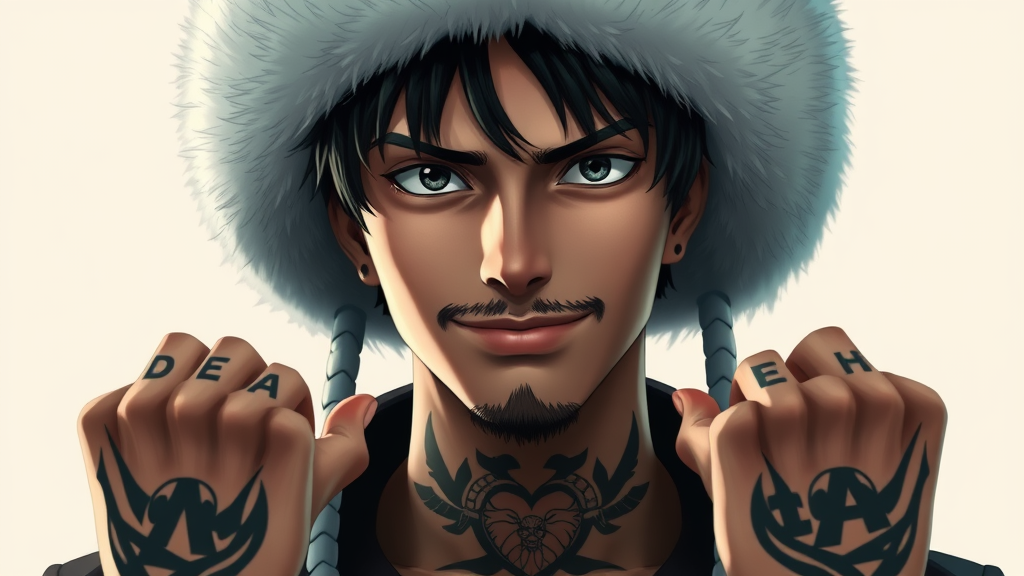 Trafalgar D. Water Law inspired character from One Piece anime, ultra realistic and hyper detailed, tall and slim young man with a confident smirk, wearing a northern-style fur hat in pristine white adorned with a subtle dotted pattern at the base and brim, short dark hair slightly tousled, defined dark sideburns and a neatly trimmed small goatee, each hand displays black-lettered tattoos spelling D E A T H on the back of his fingers, across his chest lies an intricate tribal-style heart tattoo featuring a unique Jolly Roger design, a close-up portrait capturing his enigmatic presence in ultra-realistic detail, with cinematic lighting casting dramatic shadows, offering high contrast reminiscent of character concept art seen on ArtStation, imagined in stunning 8K resolution ratio 2:3 making slight creative adjustments while maintaining the essence of the character.