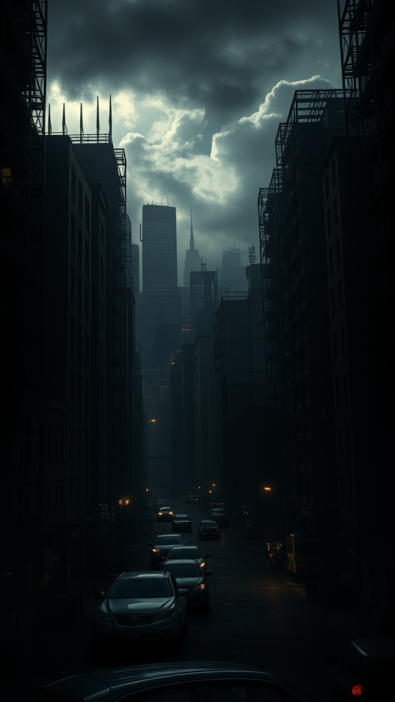 Tragic urban landscape, infused with an air of despair, dim and moody lighting enhancing the somber atmosphere, cinematic undertones with a touch of melancholy, towering structures casting long shadows, dramatic interplay of light and shade, ultra-high-definition detail, sense of deep emotional resonance.