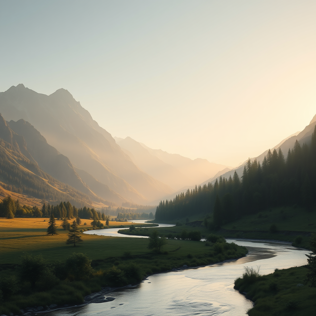 Tranquil landscape depicted in the sxnfv style, featuring a serene valley bathed in soft sunlight, with lush greenery and a gentle river meandering through. The scene is cinematic and highly detailed, showcasing a breathtaking 8k resolution with realistic textures. Majestic mountains rise in the background under a clear sky, rendered with stunning precision using octane render technology. A gentle breeze causes subtle ripples on the river’s surface, adding an element of life to the peaceful panorama.