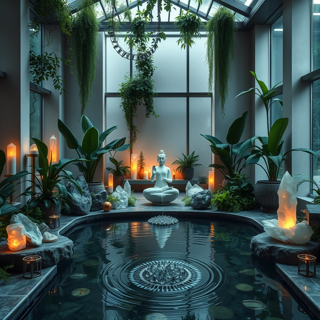Tranquil meditation sanctuary adorned with an array of crystals and lush greenery, featuring serene indoor architecture; the space exudes peacefulness with its hyperrealistic, cinematic ambiance captured in 8k ultra hd, soft ambient lighting and a gentle water feature adding a touch of calm sophistication.