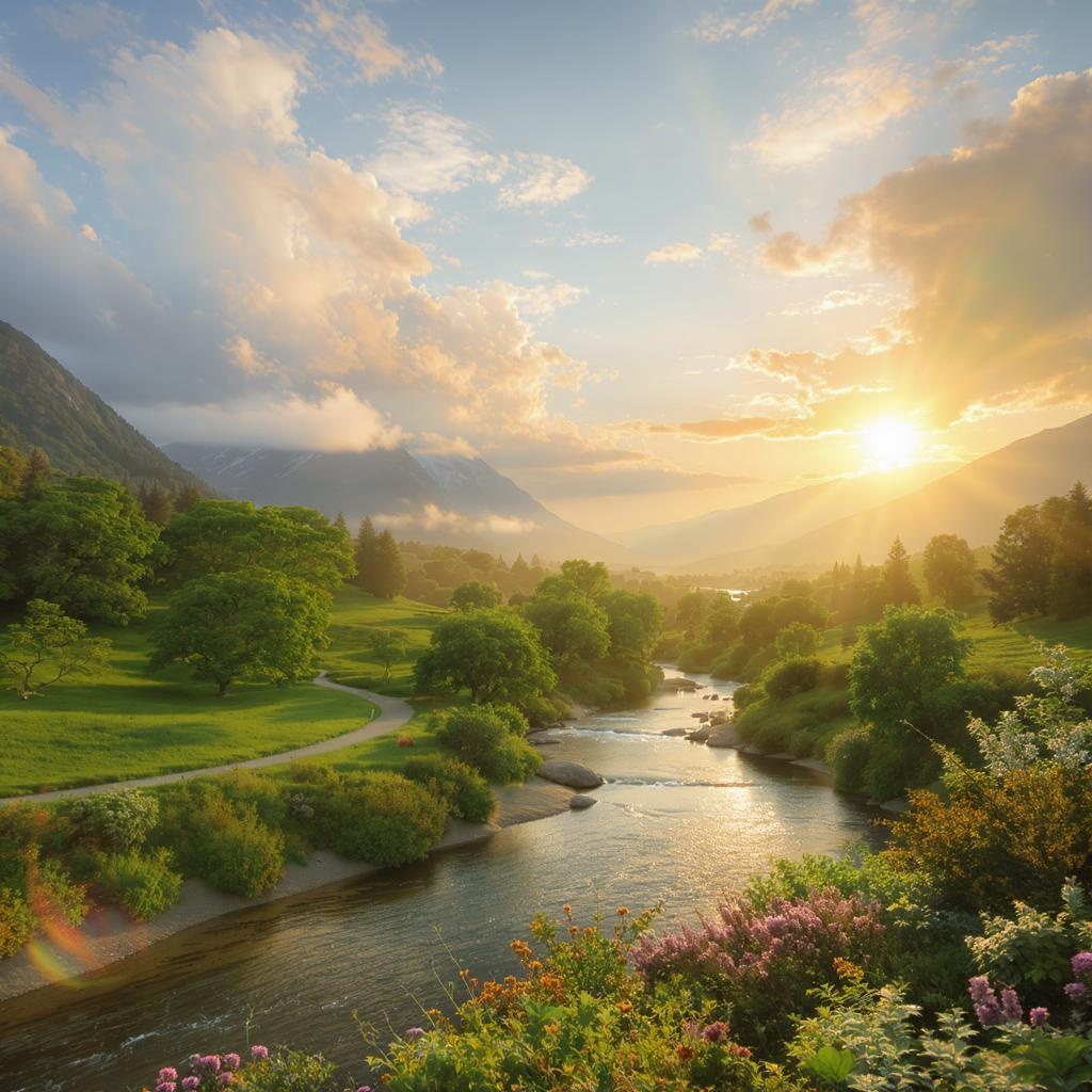 Tranquil scenery, serene countryside, cinematic atmosphere, ultra-high definition, intricately detailed, lifelike representation, rendered with precision, soft sunlight filtering through clouds, vibrant foliage, gentle river flowing, distant mountains framed by a golden horizon.