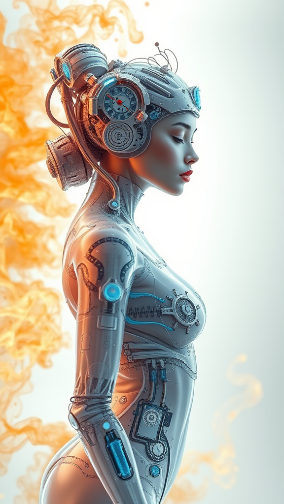 translucent biomechanical women featuring liquid cooling elements and intricate circuitry, exuding a beautiful and elegant appearance, set against a white gradient backdrop infused with orange, yellow, and golden smoke, complemented by mesmerizing blue crystal-like liquid accents, crafted to be stunning and hyper-realistic with a sense of ethereal sophistication, octane render, slight creative adaptations enhancing anatomy and composition details