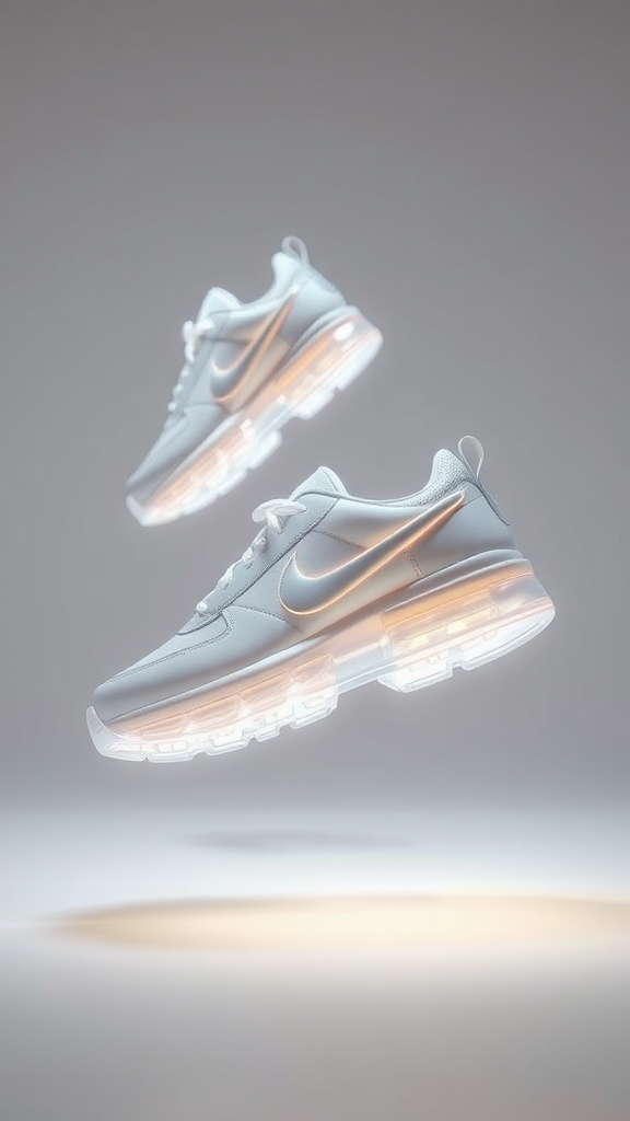 Translucent innovation in product design, featuring Nike sneakers with an ethereal 3D render, illuminated by Octane. A calm yet striking contrast as they seemingly float in the air, showcasing a bright and futuristic aesthetic.