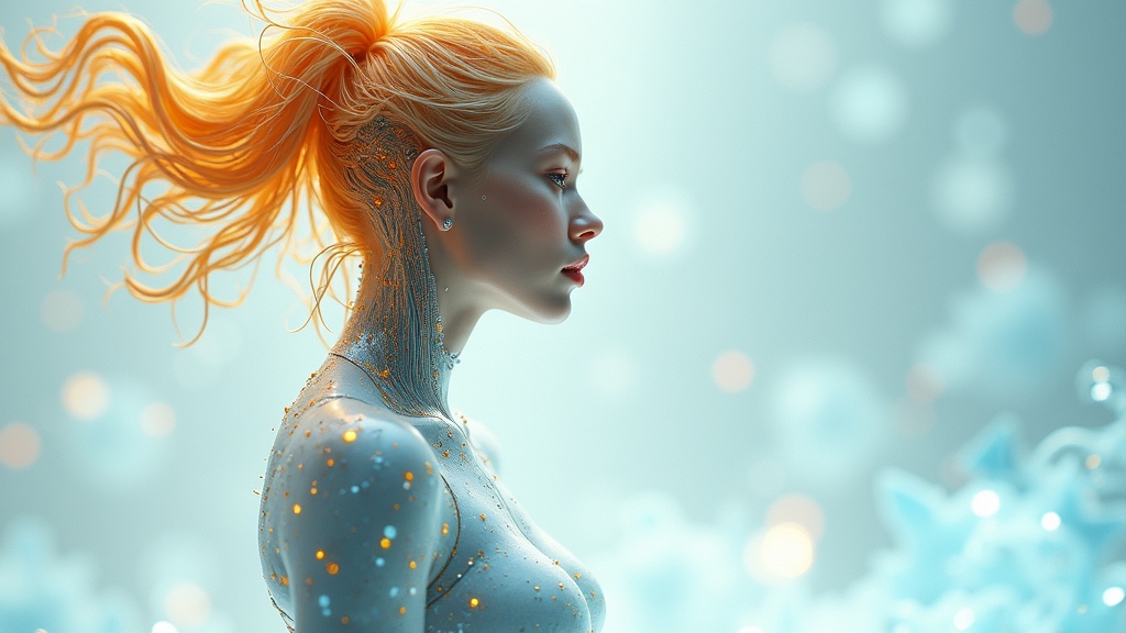 Translucent women in a biomechanical body, featuring liquid cooling, intricate circuits, and an elegant design. The white gradient is infused with hues of orange, yellow, and golden smoke, complemented by mesmerizing blue crystal liquid. The image is stunning, rendered in hyper-realistic detail, with the essence of octane render, while incorporating subtle and creative modifications.