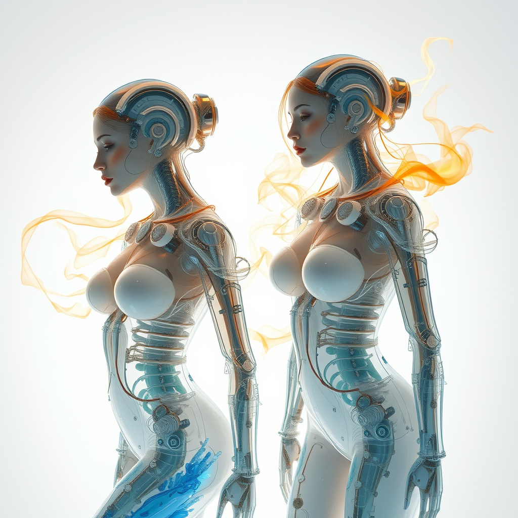Translucent women with biomechanical bodies, featuring liquid cooling systems and intricate circuits, appear beautiful and elegant against a white gradient backdrop. Wisps of orange, yellow, and golden smoke dance around them while blue crystal liquid flows seamlessly. The hyper-realistic render captures the stunning details with an aura of surreal elegance.