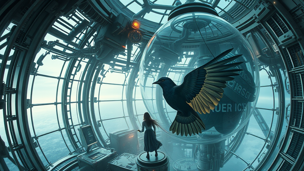 Trapped in a mechanical labyrinth where freedom is a distant dream, she is like a bird confined to a glass dome, longing for skies that no longer exist, her spirit yearning to soar above a cold, dystopian world.