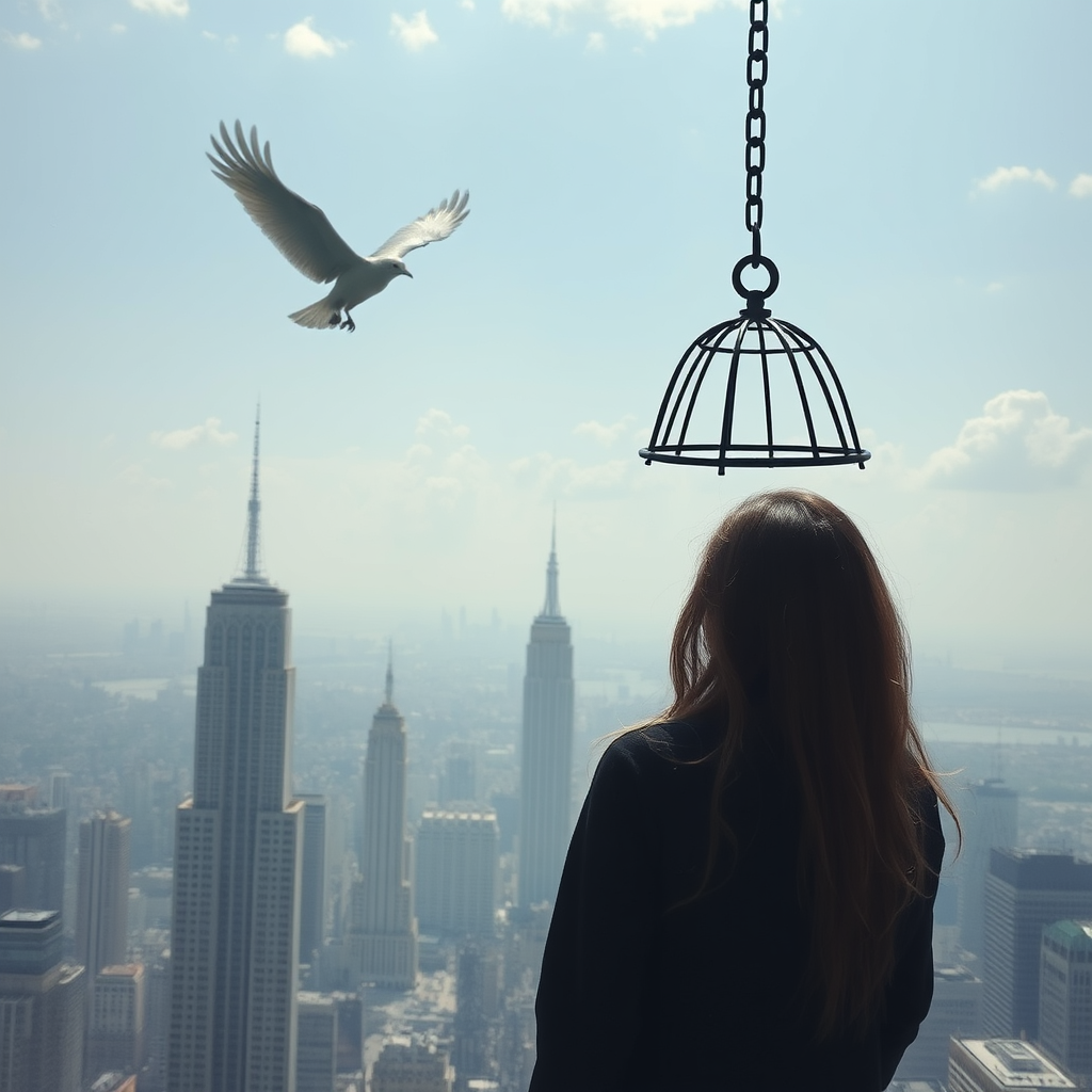 Trapped like a bird in a cage, she gazes at a hollow skyline where freedom is a forgotten dream, a dystopian world unfolds around her, with towering structures casting endless shadows, suffocating the hope of ever spreading her wings.