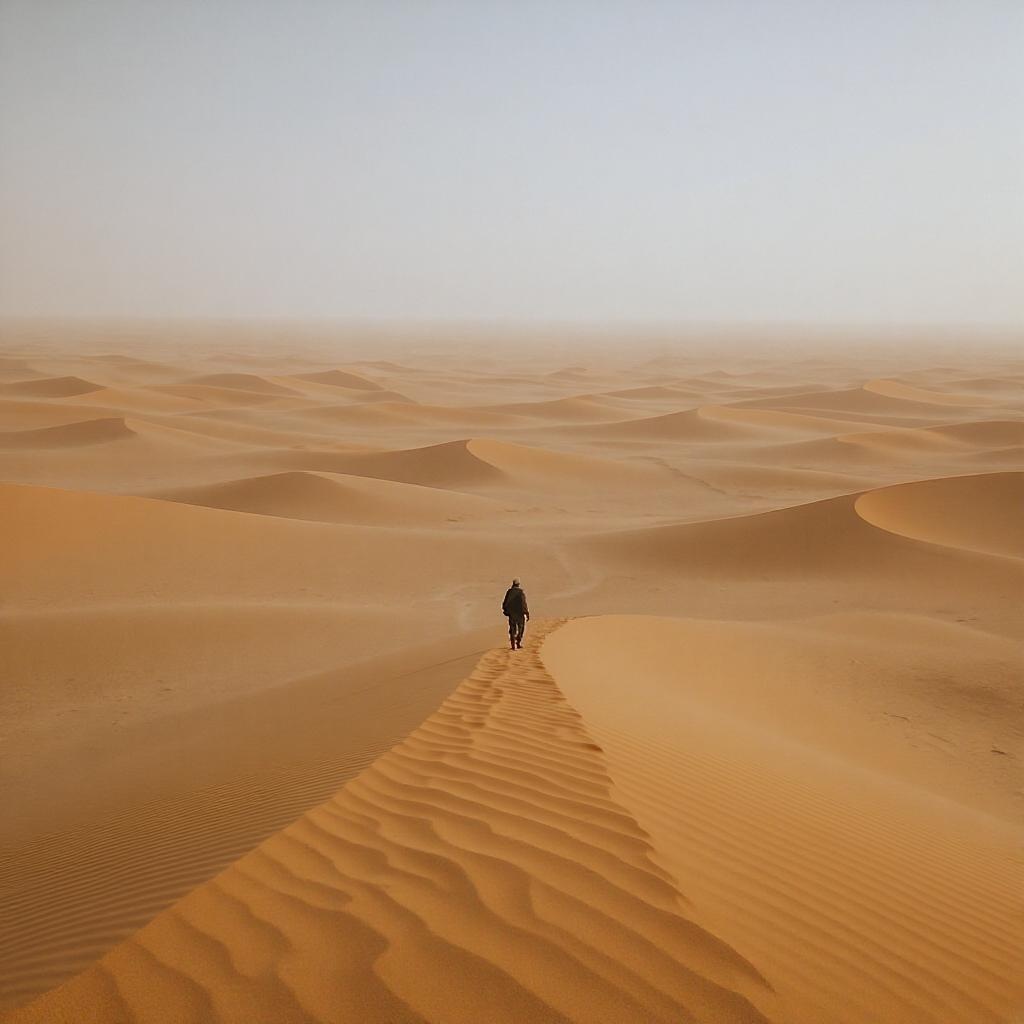 A lone traveler journeys through an endless desert landscape, where the horizon blurs into the sky, and the only companions are whispers of the wind and the shifting patterns of the dunes.