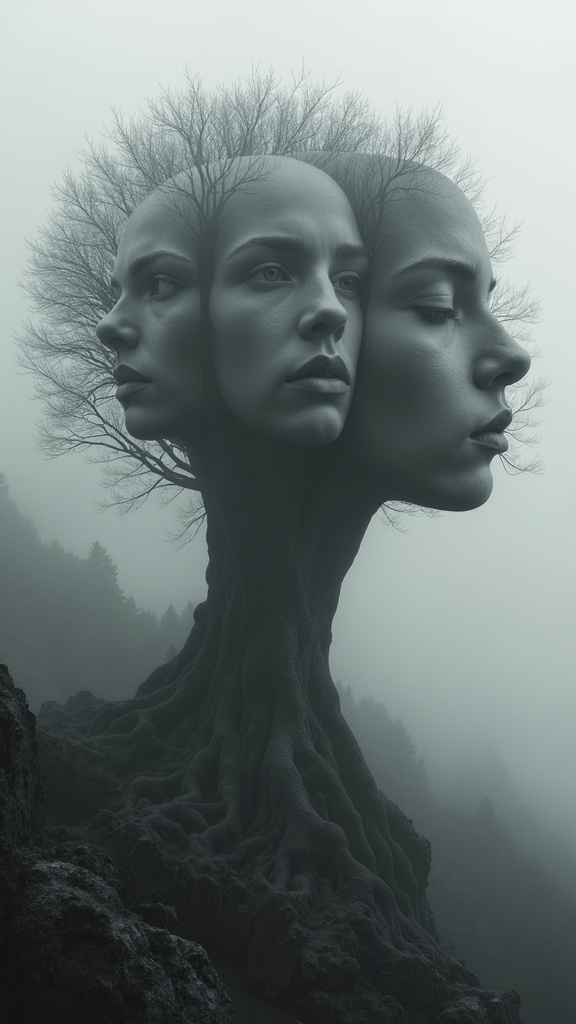 View this AI-generated image featuring a surreal tree composed of intertwining human faces set against a mystical fog covered mountain backdrop capturing the essence of a dark and moody landscape in black and white the scene evokes cinematic hyper realism where each face tells a hidden story within