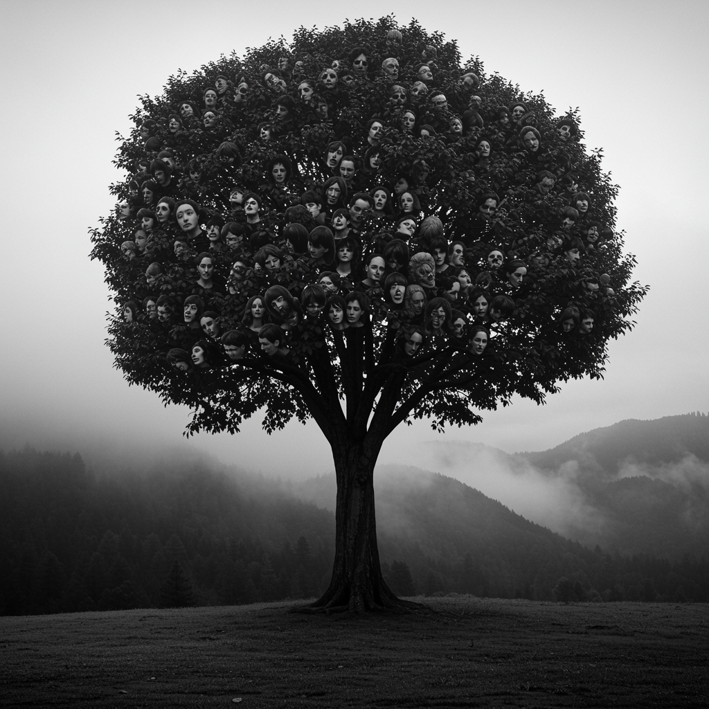 A mesmerizing tree composed of an intricate tapestry of human faces, set against the backdrop of a mist-shrouded mountain landscape. The scene evokes dark surrealism, captured in the stark contrast and depth of black and white photography, with an essence of cinematic hyper-realism permeating through the fog-laden atmosphere.