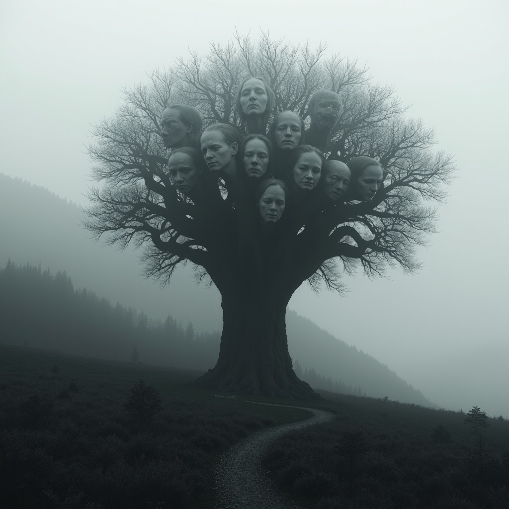A haunting tree intertwined with numerous human faces, set against a mist-shrouded mountain backdrop, the mysterious landscape enveloped in fog, exuding an aura of dark surrealism. Captured in striking black and white, this cinematic hyper-realistic scene invites viewers into a dreamlike, otherworldly realm.