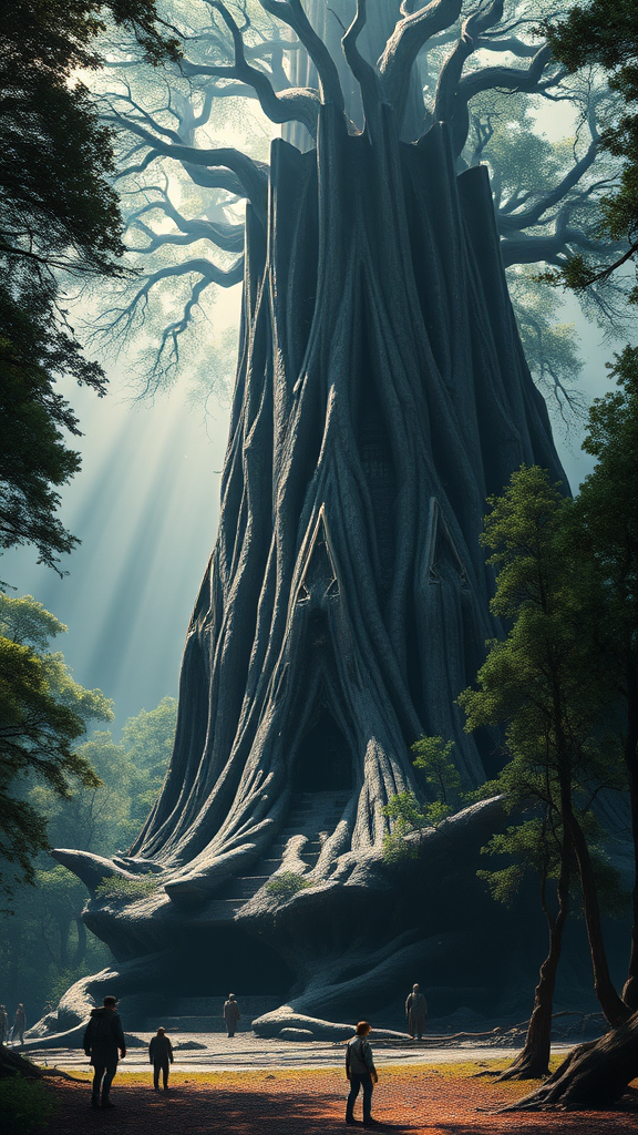 Treebeard at the base of the imposing tower of Orthanc, a digital painting of hyper-realistic quality, blending fantasy and Surrealism, reminiscent of the works of Alan Lee and John Howe. Featured on ArtStation, the piece boasts sharp focus and an expansive wide-angle view that captures the sci-fi essence of this stunningly beautiful yet dystopian scene. Soft god rays pierce through the canopy above, bathing the area in cinematic lighting that enhances the dark, mysterious atmosphere. Rendered in 16k UHD with HDR, the painting exhibits meticulous details and a breathtaking composition. Unique artistic touches include subtle mutations and a dreamlike quality, adding to the surreal character of the scene, without detracting from its core essence.