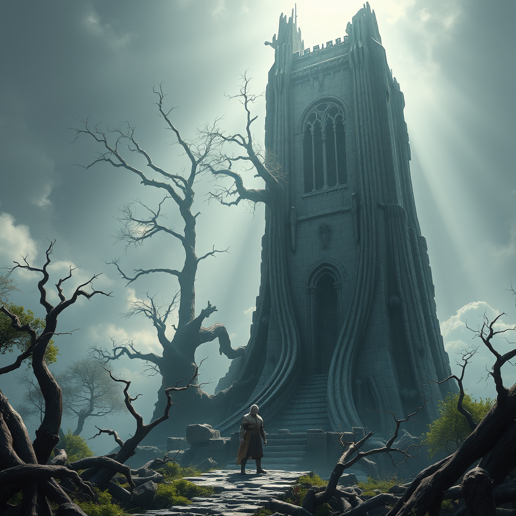 Treebeard stands majestically at the base of the imposing tower of Orthanc, surrounded by the twisted remnants of nature reclaiming the land, rendered in a hyper-realistic digital painting. This fantasy scene, influenced by the Surrealist styles of Alan Lee and John Howe, is a visual feast featured on ArtStation. The image is intricately detailed, capturing every crevice and texture, with sharp focus that reveals the intricacies of the environment in a wide-angle shot. A sci-fi atmosphere pervades the scene, enhanced by stunningly beautiful, dystopian undertones. God rays pierce through the dark, cinematic lighting, casting an ethereal glow over Treebeard's ancient form. The scene is captured in a vivid 16k resolution, offering UHD and HDR quality. While Treebeard's visage remains as wondrous as it is otherworldly, with a slightly elongated neck and immense hands suggestive of his immense strength, creative liberties subtly alter aspects like his eyes to lend a mythic touch to his character. The scene avoids any digital artifacts such as signature marks, watermarks, or blurred details, maintaining a high-resolution quality without text intrusions or distortions, and is devoid of any elements that would obscure or detract from the central focus on Treebeard and Orthanc.