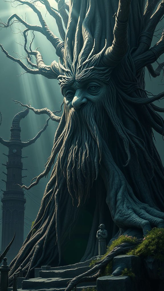 Treebeard stands majestically at the tower of Orthanc, surrounded by the intricate details of the scene. The digital painting exudes a hyper-realistic fantasy aura with a touch of surrealism. Influenced by the styles of Alan Lee and John Howe, the artwork could be featured on ArtStation, showcasing a highly detailed, sharp focus captured through a wide-angle shot. The setting blends sci-fi and fantasy elements, creating a stunningly beautiful yet dystopian atmosphere. God rays pierce through the cinematic lighting in the dark setting, enhancing the 16k, UHD, HDR quality of the piece. Treebeard's features are partly exaggerated, with a unique artistic twist—his eyes mildly distorted, hinting at a whimsical charm, and hands subtly reimagined with an essence of mutation portraying his connection to nature. The scene remains carefully composed, avoiding common artistic distractions like low-resolution artifacts, watermarks, or misplaced signatures, offering a deeply immersive and captivating visual experience.