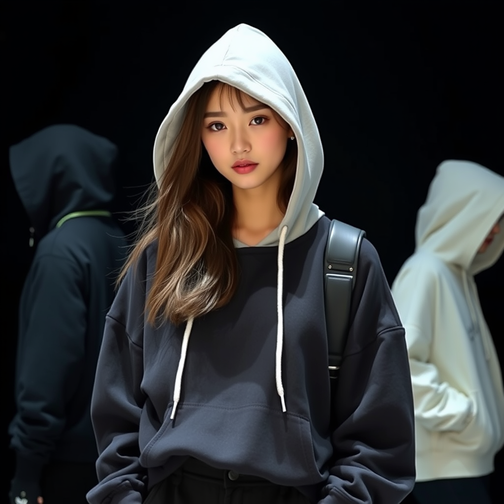 Trendy hoodies for Korean girls styled against a dark backdrop, emphasizing contemporary fashion and urban chic elements with subtle creative touches.