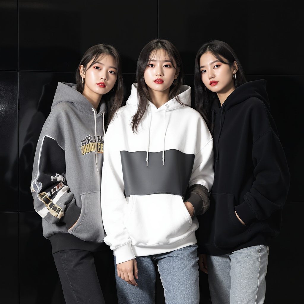 View this AI-generated image featuring trendy korean girls sporting stylish hoodies against a sleek black backdrop reflecting a blend of contemporary fashion and modern urban aesthetics. Created using advanced AI technology, this image showcases creative visuals, AI artwork. Perfect for creative pro