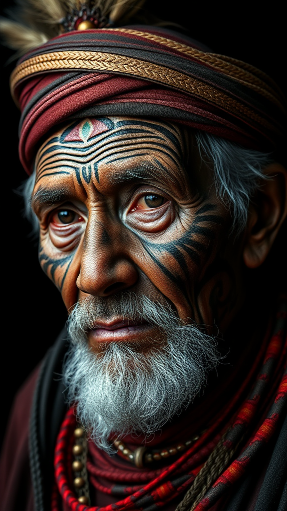 Tribal elder featuring an intricate face tattoo, yang08k style, captured in exquisite photography against a deep black background. The image is vibrant, with a harmonious blend of colors that brings out the elder's wisdom and beauty, showcasing a realistic and detailed portrayal. This masterpiece exudes top quality and aesthetic elegance, embodying official art standards. It evokes a sense of tradition and artistry, comparable to a collage of cultural significance. The piece could be adorned with an artist's signature discreetly in the corner, but without any visible watermark or artist logo, allowing the elder's presence to be the focal point of this extraordinary portrait.