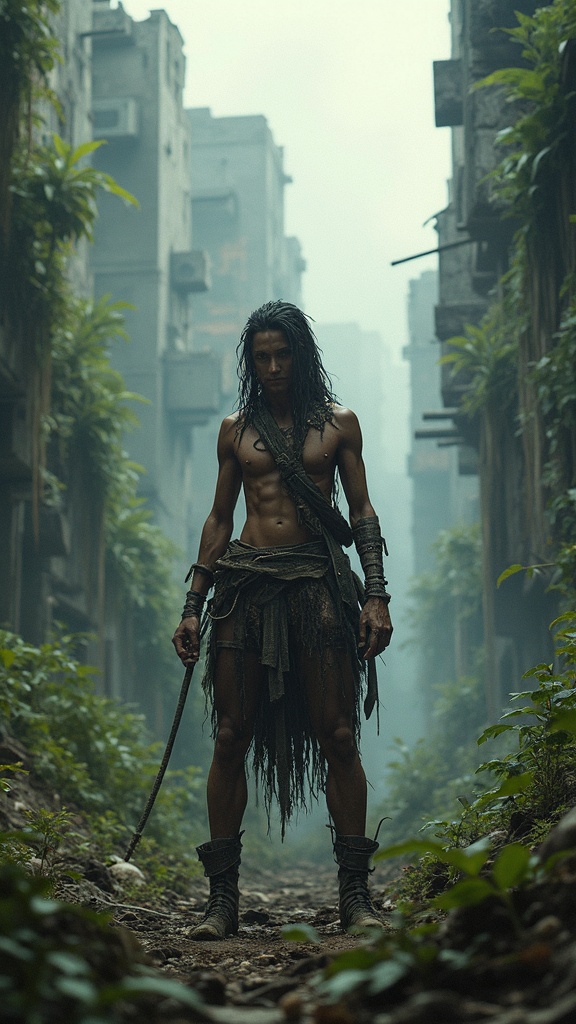View this AI-generated image featuring a daring tribal warrior stands confidently amidst the ruins of a post apocalyptic city overtaken by lush wild vegetation the scene is imbued with the signature styles of luis royo and greg rutkowski featuring dark gritty details and intricate textures volumetri