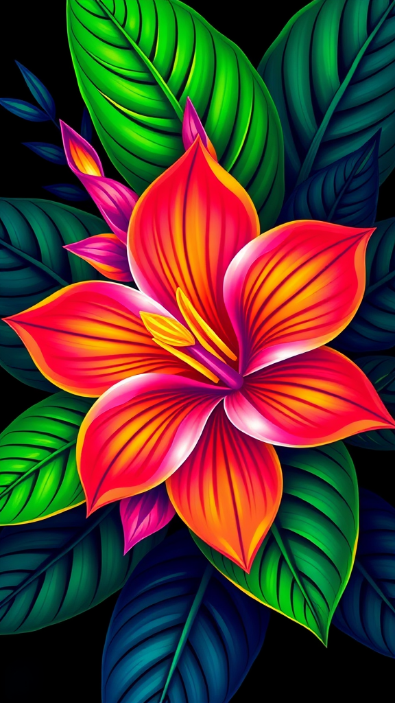 Tropical flower design infused with vibrant fluorescence, inspired by Frida Kahlo's bold style, using a rich RGB color palette, and emphasizing vivid, lush details without any drop shadow effects.