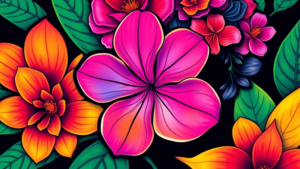 Tropical flower sticker infused with fluorescent colors, inspired by Frida Kahlo, vibrant RGB palette, elegant and crisp without drop shadows.