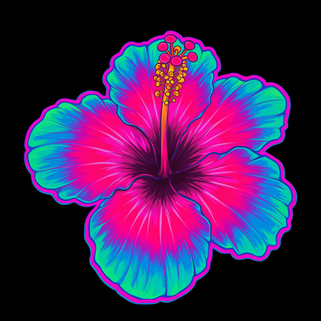 Tropical flower sticker infused with vibrant, fluorescent colors, inspired by Frida Kahlo's artistic style, featuring bold RGB hues, emphasizing clarity and vividness.