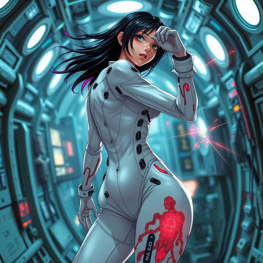 Tsutomu Nihei style, Young Girl in White Tight Sci-fi jumpsuit, cyberpunk, slick black hair with purple tips, frayed edges of the jumpsuit revealing mechanical components, Sci-fi spaceship interior, cold metallic walls, flickering fluorescent lights, chilly draft rustling her hair, graphics-inspired aesthetic, anime-inspired movements, body stretching and contorting in unusual ways due to genetic engineering, muted blues and greys with bursts of neon blue, gigantism, sharp angles and right angles, multiple storeys of the spaceship's interior revealed, blurred background of endless space, hyper-detailed mechanical systems, clumps of energy swirling around her body, flashes of light from sparks, third-person perspective, overpowering cold light from above, often round illumination of screens and monitors, unique patterns of red circuitry on her body, deformed body parts exaggerated for effect, risen torso folds, inner fiends battling from within, grotesquely oversized muscular mass wasted by malfunctioning processes, dynamically in motion, flavouring contemporary cyberpunk with strong Nihei inspirations.