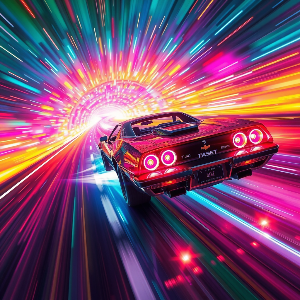 Turbo-charged futuristic ride traveling at warp speed through a luminous, multicolored cosmic highway, merging the intensity of Knight Rider with the velocity of light, creating a dazzling cascade of vibrant neon and extreme rainbow currents, captured with vivid cinematic lighting and intricate details in an illuminated spectacle.