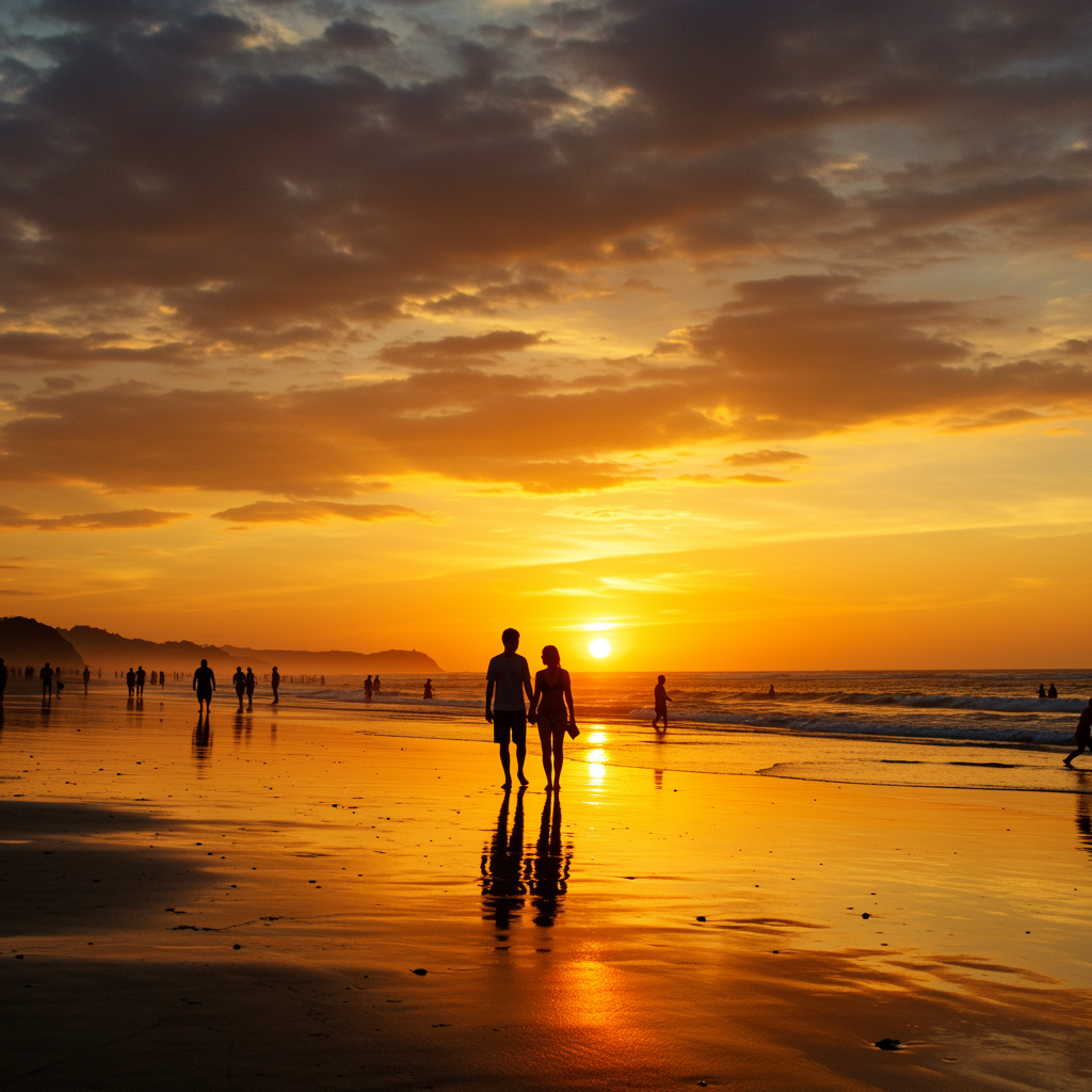Twilight Beach: Wander to the shore during the golden hour and photograph the mesmerizing figures of beachgoers outlined against the kaleidoscope of colors painted by the descending sun.