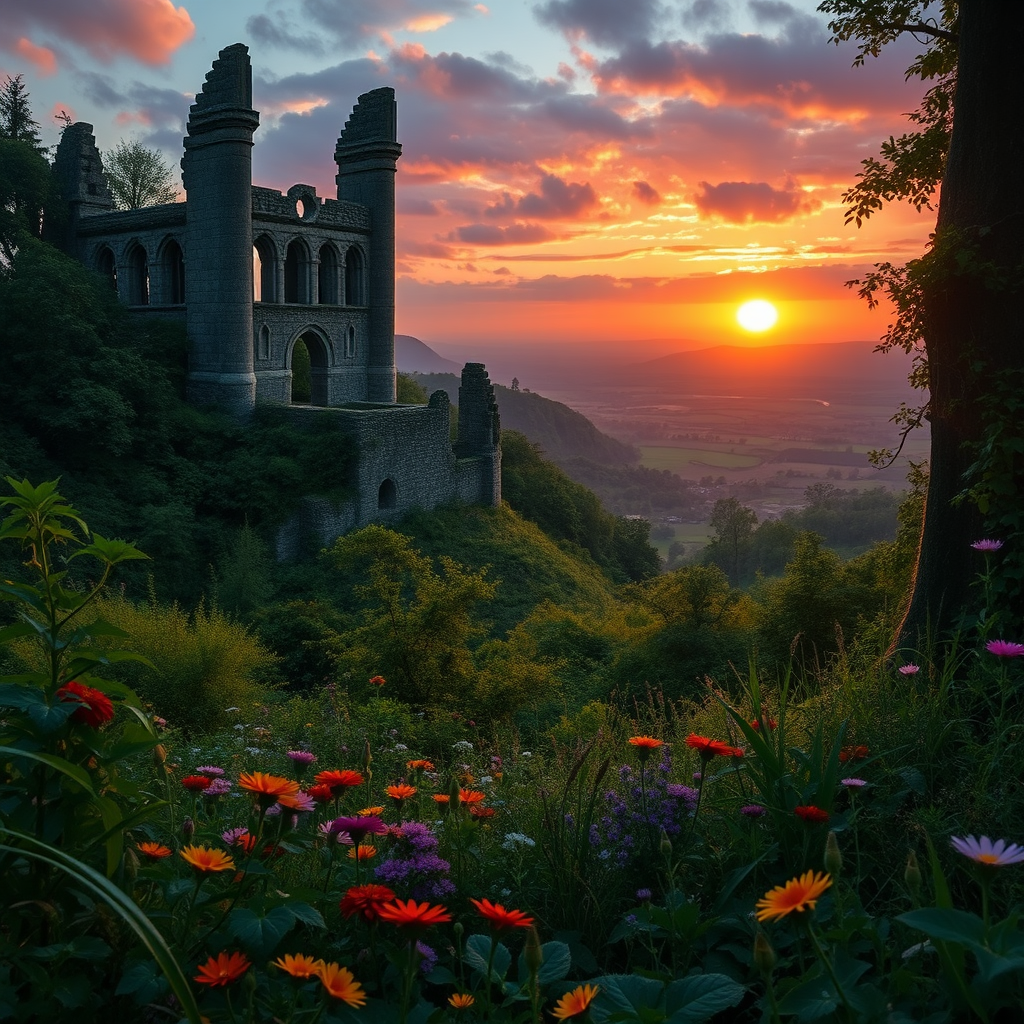 Twilight descends over a mystical, lush Celtic realm, where towering ancient ruins peek through dense overgrowth, vibrant wildflowers dot the verdant landscape, and a deep amber sun casts enchanting glows across the horizon, enhancing the magical aura of this ancient kingdom.