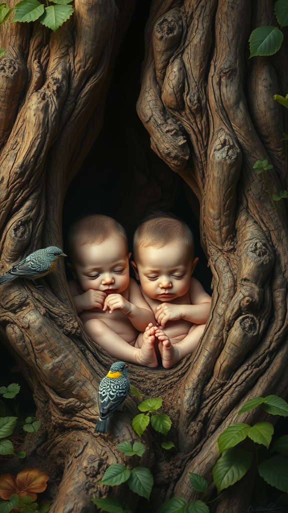 Twin infants nestled within the crevices of ancient trees, captured in hyperrealistic wildlife portrait style, infused with avian motifs reminiscent of Stephen Shortridge, Lilia Alvarado, and Bob Eggleton. This detailed nature study showcases the delicate interplay of light and shadow, highlighting the fine textures of bark and the ethereal softness of the babies' features. Encircled by an ambiance of vibrant foliage and feathered companions, the scene exudes a raw, untamed essence of the natural world, emphasizing the juxtaposition of innocence against a backdrop of wilderness.