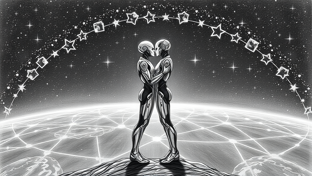 Two advanced cyborgs embrace in a kiss, poised on the boundary of the cosmos, their forms mirrored against the vast expanse. A cascade of stars arcs around them, creating a celestial backdrop that echoes with the harmony of the golden ratio. The scene is rendered in an intricate sketch art style, capturing the fusion of technology and emotion against the limitless universe.