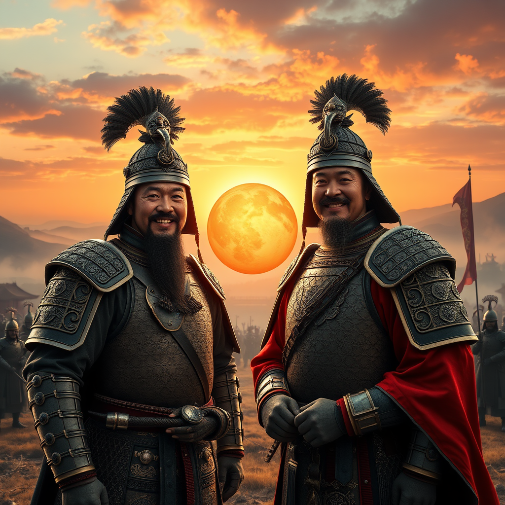 Two Ancient Chinese generals, clad in elaborate battle armor, stand shoulder to shoulder on the battlefield, capturing a moment of camaraderie with a modern twist as they smile confidently at a glowing orb that frames them together under a vibrant sunrise, the vast, historical landscape of rolling hills and misty valleys stretching out behind them, warriors and banners hinting at the epic battle to come.