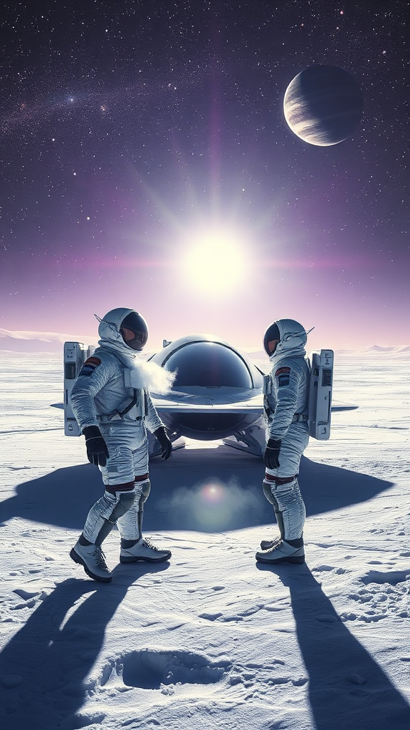 Two astronauts, bundled in high-tech space suits, stand on the surface of a vast, icy moon. Their breath forms soft clouds in the frigid air as they lean slightly against their sleek, silver spacecraft, which casts long shadows on the frozen terrain. Above, the sky is a tapestry of distant planets and shimmering stars, painting a breathtaking cosmic vista in shades of violet and indigo. A bright, nearby gas giant dominates the horizon, its swirling bands visible even from afar. The surface beneath them glistens like crushed diamonds, and in this ultra-realistic science-fiction scene, the silent majesty of space is palpable, filled with both wonder and isolation.