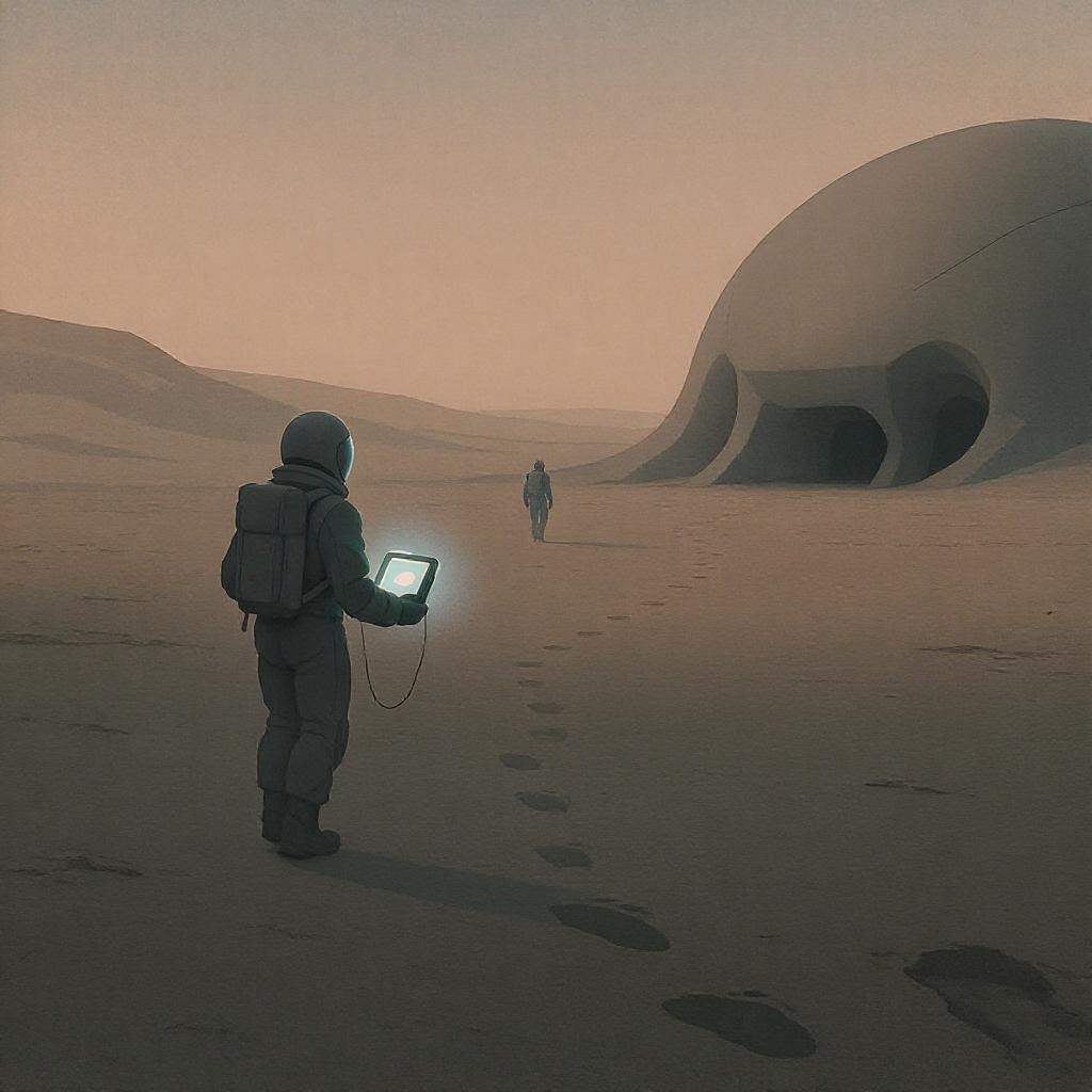 Two astronauts traverse the barren landscape of an alien world, one clutching a sleek visualization device that emits a soft, ambient glow. Nearby, an enigmatic alien structure stands, its smooth, otherworldly architecture contrasting with the desolate terrain. A series of peculiar footprints, larger than human, wind their way towards the entrance of the building, hinting at recent activity. The scene, captured in a digital painting style, exudes futuristic realism with flat, muted tones and minimalist details. Inspired by Enki Bilal, the image evokes a sense of intrigue and mystery, with subtle variations in color conveying a subdued, otherworldly atmosphere.