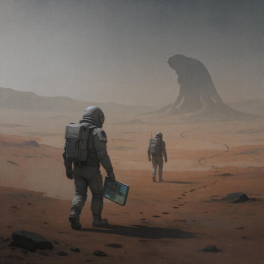 Two astronauts traverse the barren landscape of an alien planet, one grasping a sleek visualization device. Nearby, an enigmatic alien structure looms, with a trail of indistinct footprints meandering towards it. The scene unfolds in a concept art style, featuring a digital painting with a sense of futuristic realism. The background is stark and minimalistic, imbued with low-saturation hues that evoke an air of mystery. The artwork reflects the distinctive touch of Enki Bilal, with its subtle yet uncanny details, capturing the essence of exploration and intrigue on an otherworldly frontier.