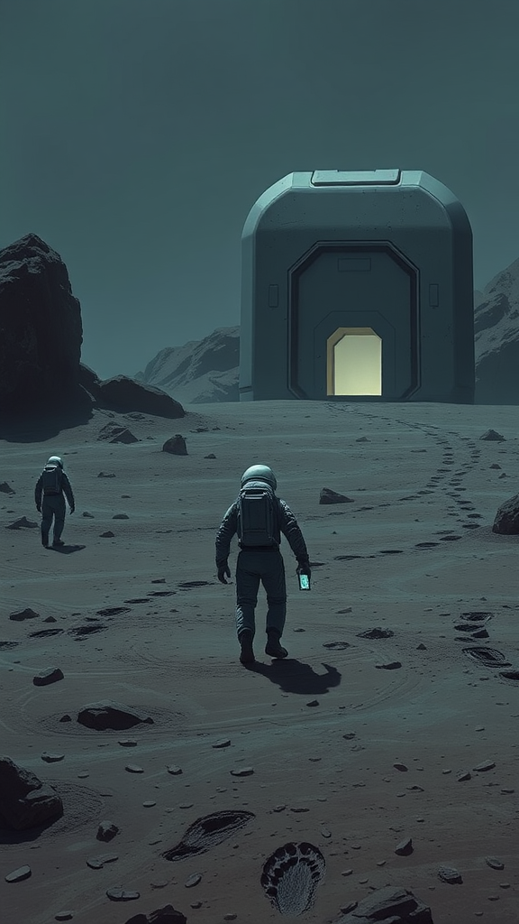 Two astronauts traverse the rocky terrain of an alien planet, one of them grasping a handheld visualization device that glows subtly in the dim light. Beside them stands an enigmatic alien structure, its smooth, angular surfaces casting elongated shadows. A trail of distinct footprints meanders towards the entrance of the building, hinting at an unseen presence. The scene, depicted in a concept art style, offers a digital painting that captures a sense of futuristic realism. The background is stark and minimalist, with simple details and muted, low-saturation colors, echoing the artistic essence of Enki Bilal's work.