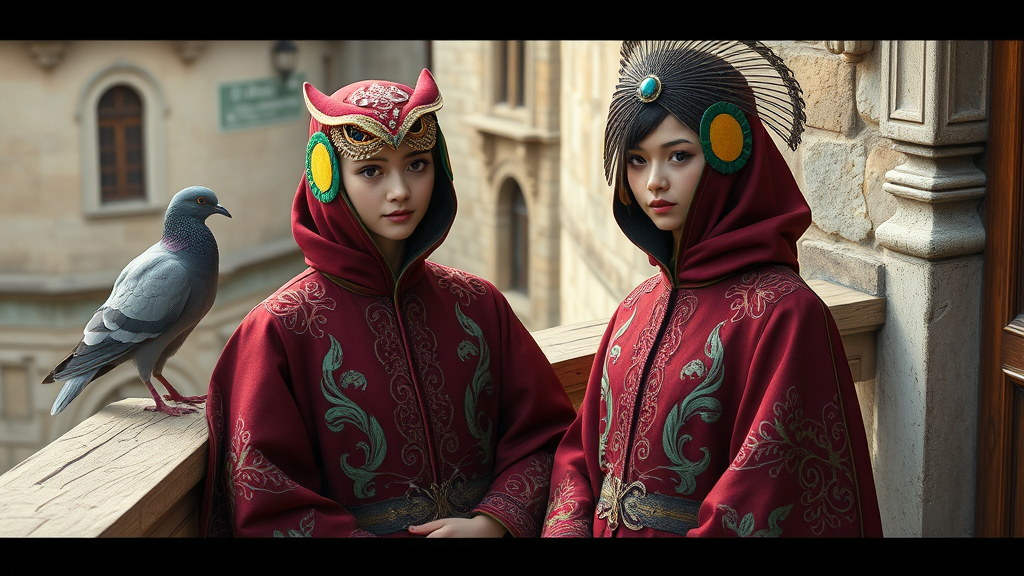 Two avian-inspired individuals, clad in intricately embroidered maroon robes with emerald accents, stand amidst the ancient architecture of the city. Soft, natural light casts a warm glow on their elaborate headdresses, shaped like stylized bird beaks. One headdress features a delicate, bejeweled owl motif, while the other boasts a statement peacock-inspired design. Their eyes, rendered in realistic detail, sparkle with a hint of mischief as they seem to converse with a prominent pigeon perched atop a nearby balustrade. The subtle texture of worn wooden decking and weathered stone walls serves as a nostalgic backdrop for these charming avian personas.