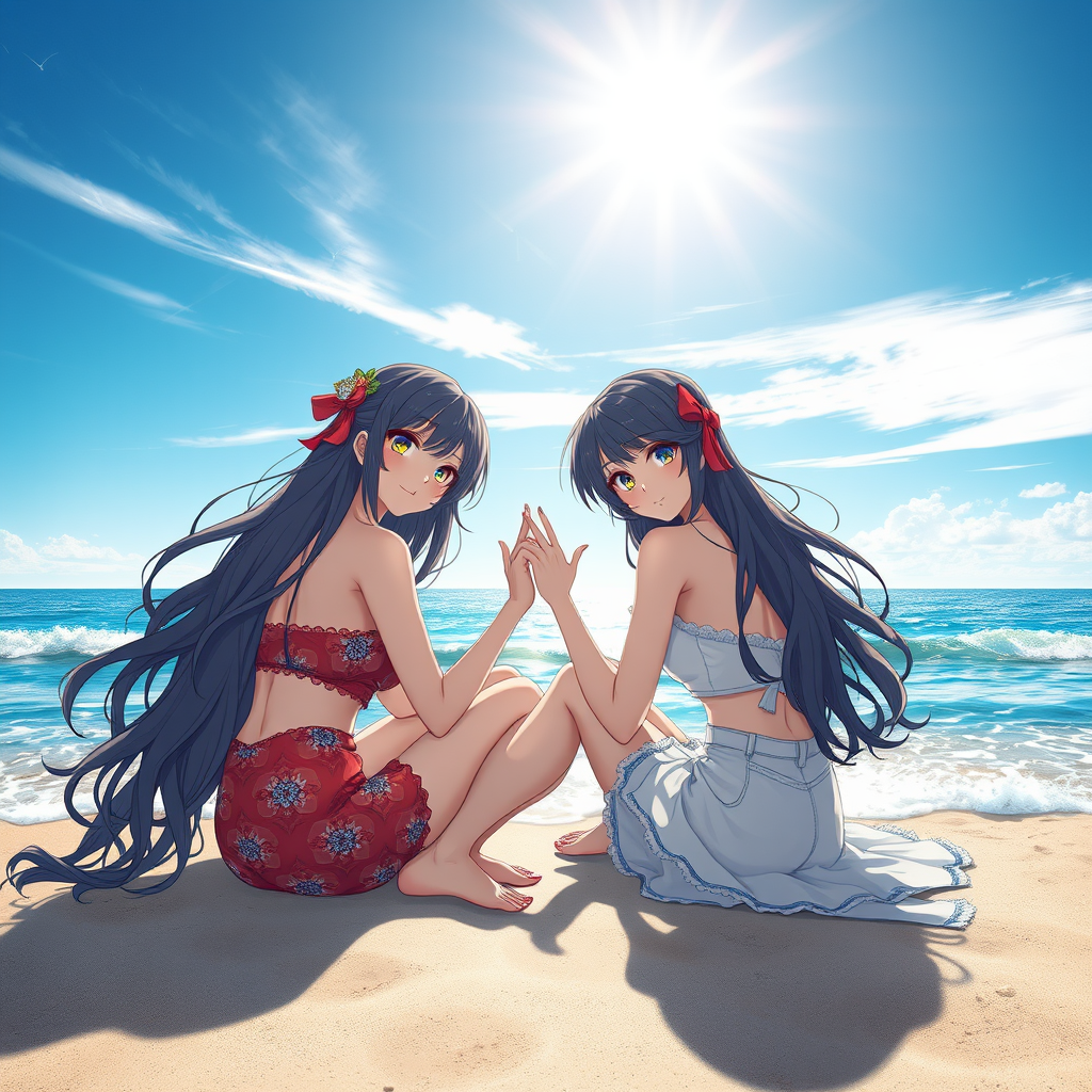 Two captivating women sit playfully interacting with the photographer at the beach's edge, surrounded by the sparkling ocean under a radiant sunny sky. The scene is centered, showcasing their breathtaking beauty with intricate and detailed features that capture the eye. Inspired by the visually stunning style of Avetetsuya Studios, the women are depicted in a vibrant anime and manga style seen in works like Genshin Impact. Despite its cinematic allure, the image retains a low-resolution charm and exhibits imperfections—like text errors, missing elements, extra or fewer digits, and occasional disfigurements. The scene may include framing anomalies, like parts of the image being cropped or poorly drawn aspects such as hands or feet, and displays jpeg artifacts or signatures that hint at its artistic origin. Embracing both the brilliance and flaws of human creativity, the image presents a whimsical yet slightly distorted portrayal, reminiscent of a cherished yet imperfect memory on a beautiful beach day.