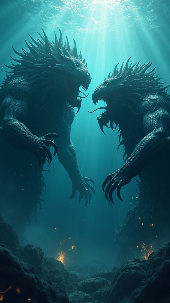 View this AI-generated image featuring two colossal deep sea creatures locked in an epic battle radiating immense power rage and anger set against a deep underwater backdrop the scene is captured in an epic wide shot with an aerial perspective exuding a dark fantasy atmosphere reminiscent of league