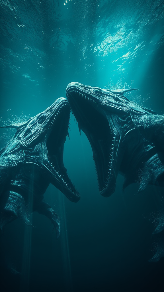 Two colossal sea creatures engaged in an epic underwater battle, exuding powerful rage and anger, set against the backdrop of the deep ocean. The scene captures an epic wide shot with an aerial perspective, blending elements of dark fantasy with the art styles of League of Legends and Sea of Thieves. The CGI-rendered composition is photorealistic, showcasing intricate, hyperrealistic details with depth focus, illuminated by crepuscular rays piercing through the water. The scene embodies a detailed and complex maximalist approach, illustrating the grandeur of this underwater confrontation.