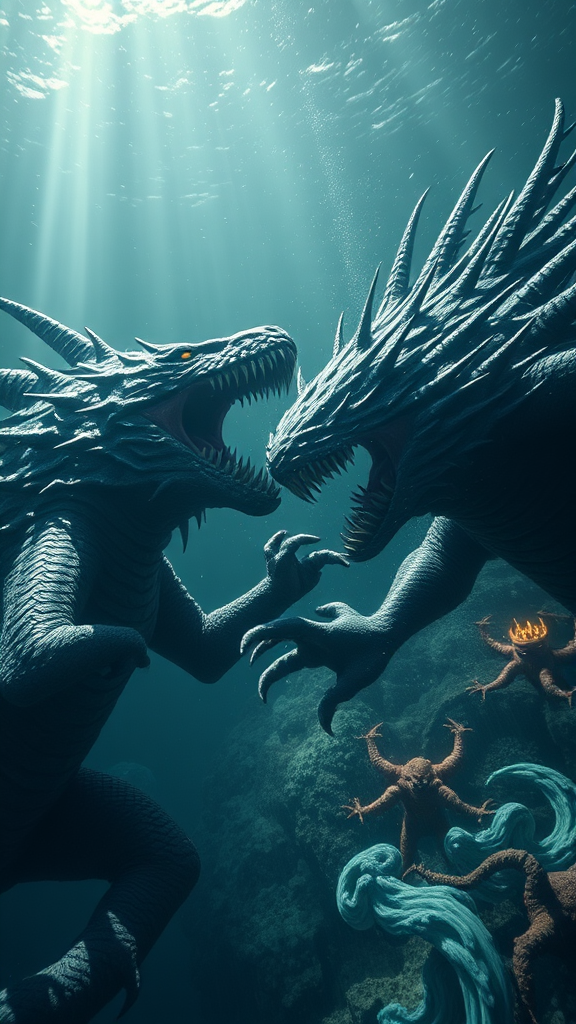 Two colossal sea creatures locked in an epic battle, their raw power and fury evident, clashing in the depths of the ocean, surrounded by an intricate underwater landscape. The scene captures an epic wide shot with an aerial perspective, set in a dark fantasy world reminiscent of League of Legends and Sea of Thieves. Utilizing advanced CGI, the image portrays a photorealistic and hyper-detailed depiction of the scene, highlighting the intricate details and textures of the massive monsters. The environment is filled with complicated maximalist details, enhanced by depth focus and streaks of crepuscular rays piercing through the water, creating an immersive, atmospheric backdrop. The composition is balanced in a 2:1 aspect ratio, adding to the grandeur and scale of the scene, blending realism with fantastical elements to create a breathtaking visual masterpiece.